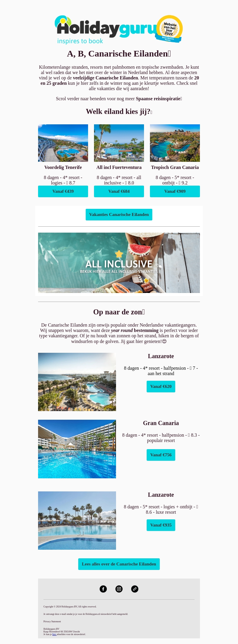 Ontsnap aan de winter en ontdek de veelzijdige Canarische Eilanden. Geniet van kilometerslange stranden, luxe resorts en een temperatuur die het hele jaar door aangenaam is. Kies jouw ideale eiland en ervaar een onvergetelijke vakantie.