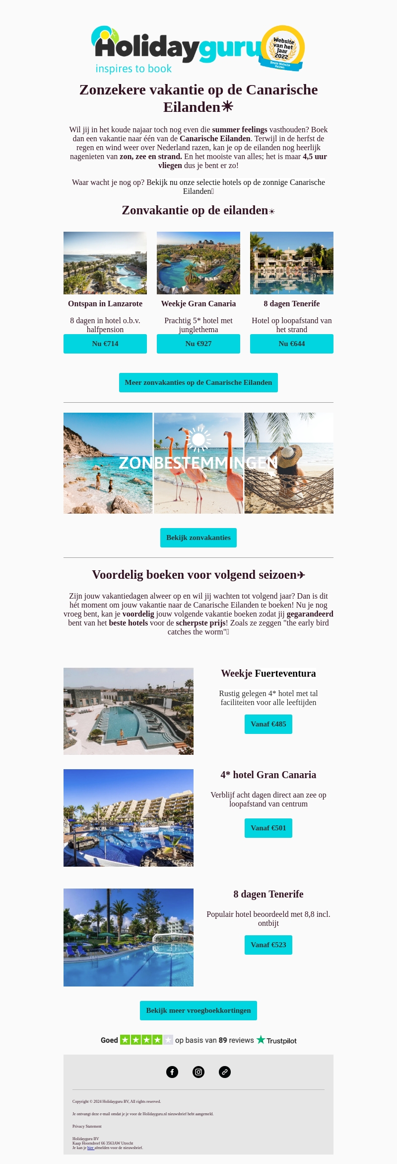 Boek jouw volgende vakantie naar de Canarische Eilanden met Holidayguru. Geniet van zonnige bestemmingen zoals Lanzarote, Gran Canaria en Tenerife. Profiteer van onze vroegboekvoordelen en kies uit de beste hotels aan scherpe prijzen.