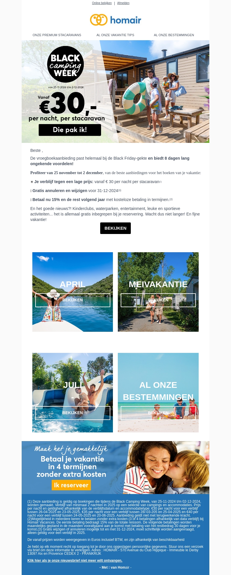 Ontdek de verrassende aanbiedingen van Homair tijdens de Black Camping Week. Voor slechts €30 per nacht kunt u genieten van een luxe stacaravan. Boek van 25 november tot 2 december 2024 en profiteer van extra voordelen, zoals gratis annuleren en betalen in termijnen. Kinderen vermaken zich in kinderclubs en waterparken, terwijl u ontspant. Mis deze kans niet!