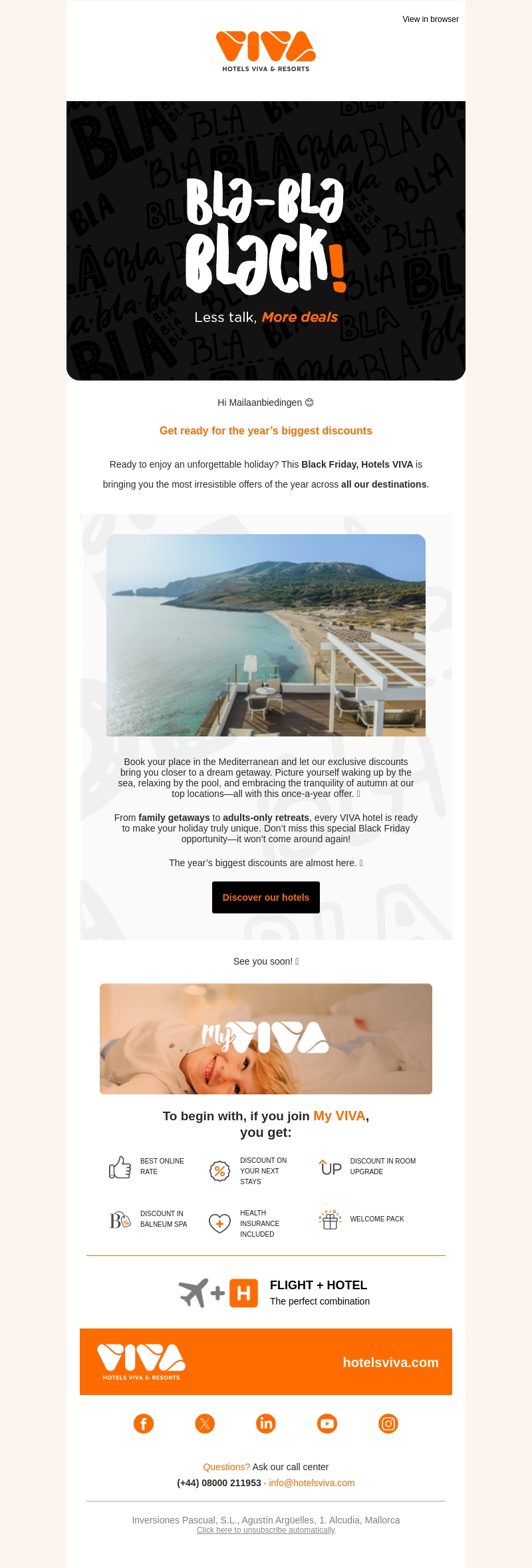 Black Friday staat voor de deur en Hotels Viva biedt de meest onweerstaanbare kortingen van het jaar aan. Van familievakanties tot adults-only retreats, je vindt alles wat je nodig hebt voor een unieke vakantie-ervaring. Mis deze kans niet om een onvergetelijke tijd door te brengen bij één van onze topbestemmingen. Ontdek nu onze hotels en profiteer van de beste aanbiedingen.