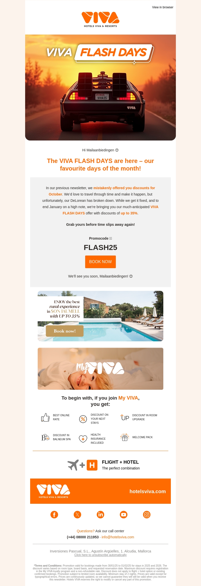 De VIVA Flash Days zijn onze favoriete dagen van de maand met spectaculaire kortingen tot wel 35%. Geniet van geweldige aanbiedingen voor je volgende verblijf. Vergeet niet om de kortingscode FLASH25 te gebruiken bij je boeking. Boek nu en laat de tijd niet voorbijgaan zonder deze kans te grijpen. Bezoek ons en profiteer van de beste deals.