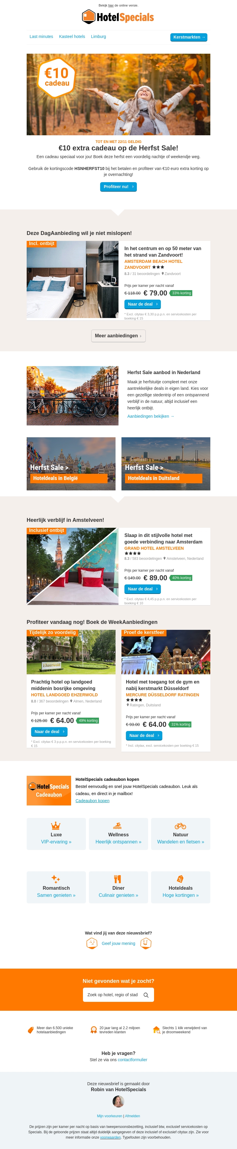 HotelSpecials biedt een speciaal cadeau van €10 op je volgende verblijf. Gebruik de kortingscode HSNHERFST10 om te profiteren van deze herfstdeal. Verblijf in de natuur of ontdek steden, inclusief ontbijt en meer. Bekijk de dagaanbiedingen en kies je favoriete hoteldeal. Mis deze kans niet om voordelig te boeken!