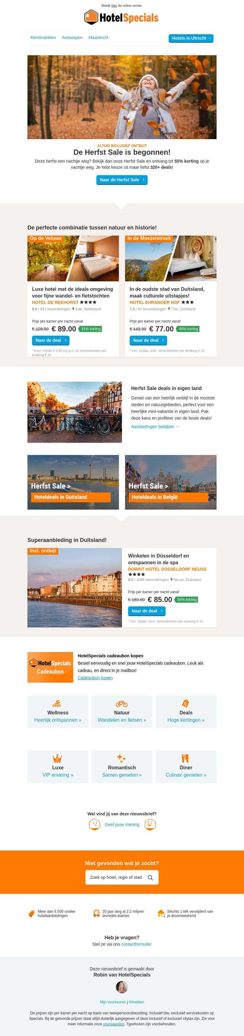 De Herfst Sale is begonnen! Ontdek meer dan 320 deals en ontvang tot 55% korting op je volgende hotelovernachting. Of je nu een natuurliefhebber bent of op zoek bent naar cultuur, er is voor ieder wat wils.