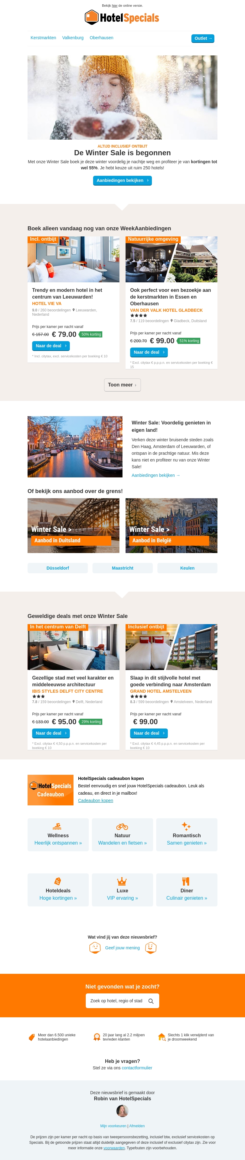 De Winter Sale bij HotelSpecials is gestart met indrukwekkende kortingen tot wel 55%! Krijg toegang tot aanbiedingen van meer dan 250 hotels en geniet van exclusieve deals. Of je nu op zoek bent naar een gezellige stad in eigen land of een vakantie over de grens, er is voor ieder wat wils. Sla geen aanbiedingen over en maak deze winter indrukwekkende herinneringen. Elke boeking is inclusief ontbijt in diverse locaties.