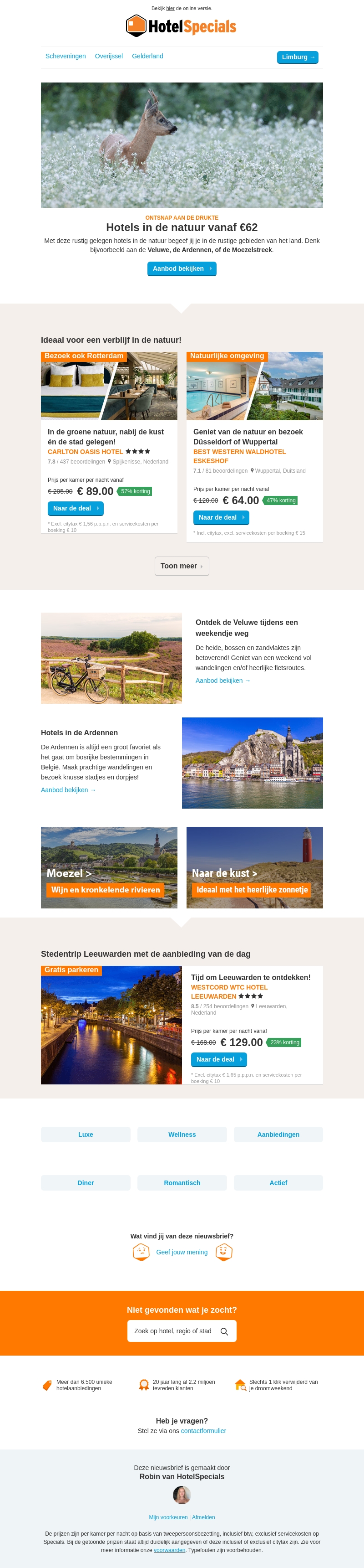 Met deze hoteldeals in de natuur kun je ontspannen te midden van groene bossen en vredige landschappen. Boek vanaf slechts €62 per nacht en geniet van een rustige vakantie in prachtige natuurlijke gebieden zoals de Veluwe en de Ardennen. Ontdek unieke locaties en profiteer van speciale kortingen bij geselecteerde hotels. Ideale gelegenheid voor een weekendje weg!