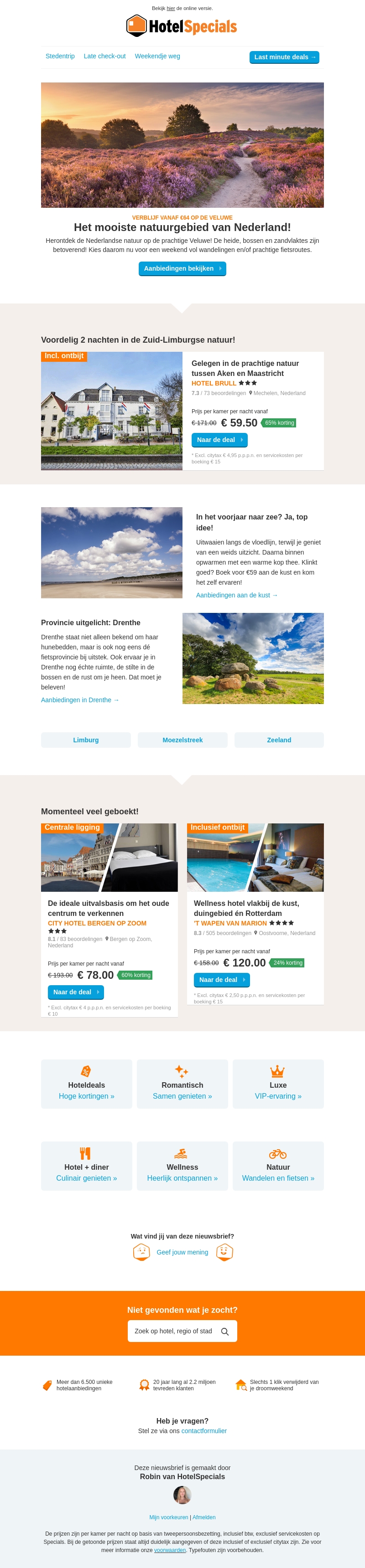 Ontdek de pracht van de Nederlandse natuur met onze exclusieve hoteldeals. Verblijf vanaf slechts €64 op de Veluwe of geniet van een voordelige overnachting in Zuid-Limburg en Drenthe. Ervaar heerlijke wandel- en fietsroutes en geniet van de serene omgeving. Profiteer nu van kortingen tot 65%. Boek vandaag nog en ontspan in de mooiste natuurgebieden van Nederland.