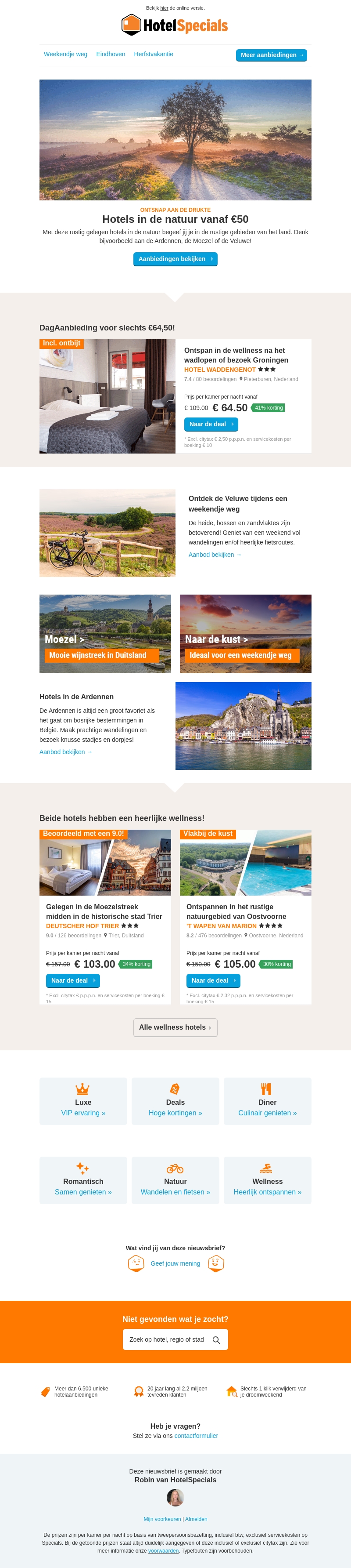 Met deze rustgevende hoteldeals ervaart u ontspanning in de natuur vanaf slechts €50. Geniet van unieke aanbiedingen zoals een wellness-arrangement in Groningen of een weekendje weg naar de Veluwe. Ontdek de schoonheid van de Ardennen of verken de Moezelstreek in Duitsland. Elke bestemming biedt een perfecte mix van natuur en comfort voor een onvergetelijk verblijf.