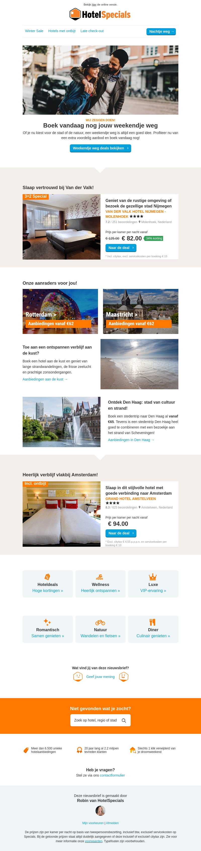 Plan je weekendje weg met HotelSpecials en profiteer van geweldige kortingen op hotels. Of je nu de stad wilt verkennen of wilt ontspannen aan de kust, er is voor ieder wat wils. Bekijk onze aanbevelingen voor Rotterdam, Maastricht en meer. Profiteer van speciale aanbiedingen bij geselecteerde hotels. Boek vandaag nog je uitje en geniet van een zorgeloos verblijf.