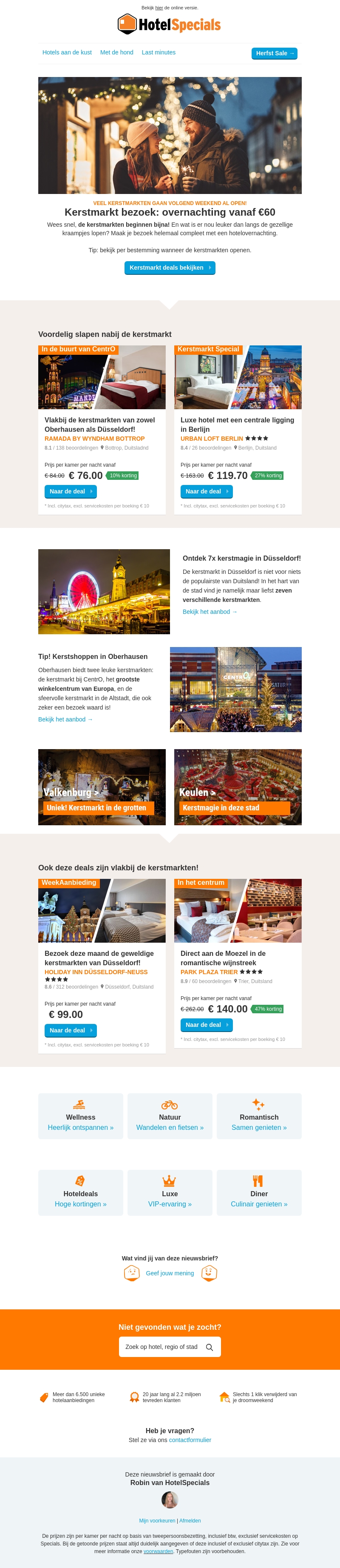 Beleef de betovering van de kerstmarkten en verblijf in comfortabele hotels vanaf slechts €60. Ontdek adembenemende kerstversieringen, geniet van lokale lekkernijen en ervaar de ultieme feestvreugde. Met tal van deals in nabijgelegen hotels, staat niets de perfecte kersttrip meer in de weg.