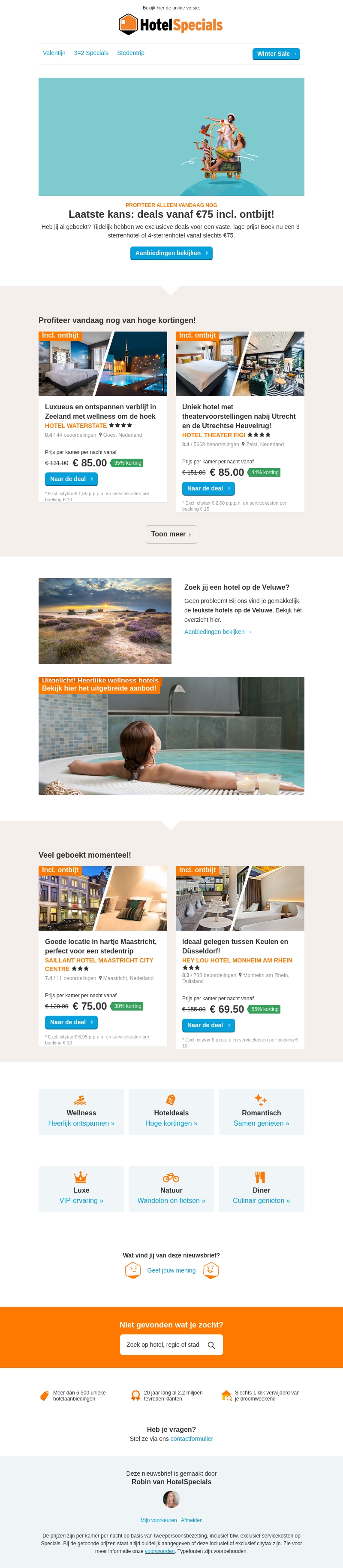 Grijp je laatste kans om te profiteren van prachtige hoteldeals vanaf slechts €75 inclusief ontbijt. Boek je verblijf in een 3- of 4-sterrenhotel en geniet van luxe voorzieningen en aantrekkelijke kortingen. Ontspan in een wellnesshotel in Zeeland of kies voor theater bij Utrecht. Perfect voor een stedentrip in Maastricht of tussen Keulen en Düsseldorf.