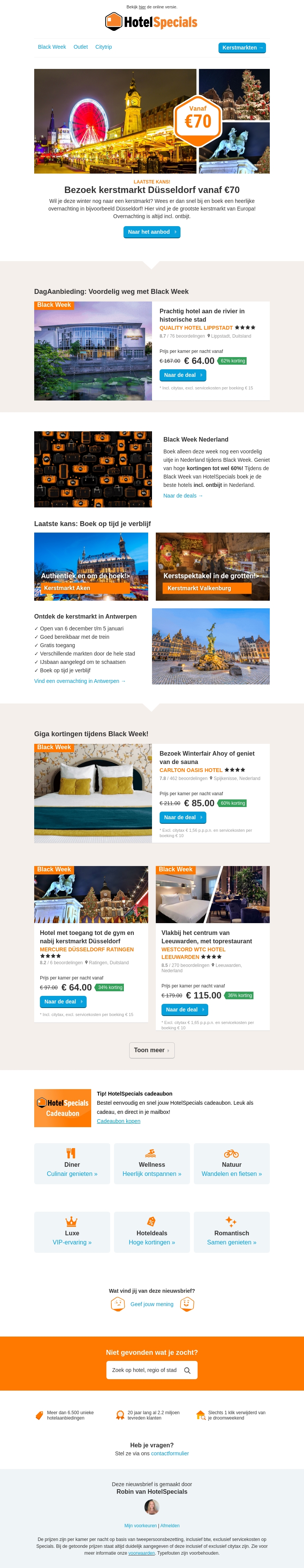Bezoek dit jaar de kerstmarkten van Düsseldorf en geniet van een onvergetelijke ervaring. Onze speciale aanbiedingen tijdens de Black Week zorgen ervoor dat je tegen een voordelige prijs kunt overnachten dichtbij de feestelijke markten. Geniet van de prachtige verlichting, heerlijke lekkernijen en unieke cadeaus. Mis deze kans niet om een magische kerstervaring mee te maken. Boek nu jouw verblijf voordelig.