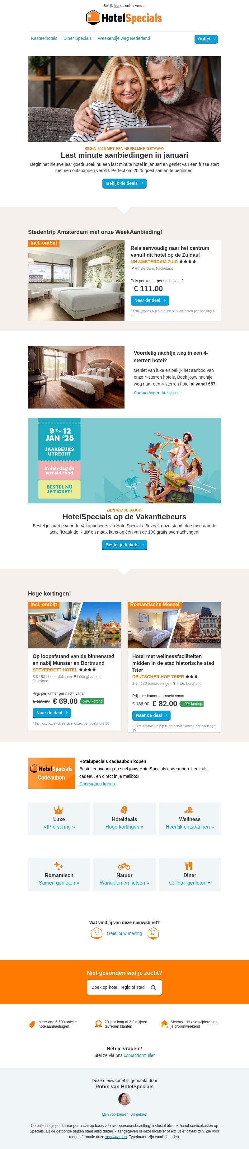 Begin het nieuwe jaar met exclusieve last minute hoteldeals in januari. Geniet van een ontspannen verblijf in een 4-sterren hotel voor verrassend lage prijzen. Mis onze speciale aanbiedingen niet en boek nu via HotelSpecials!