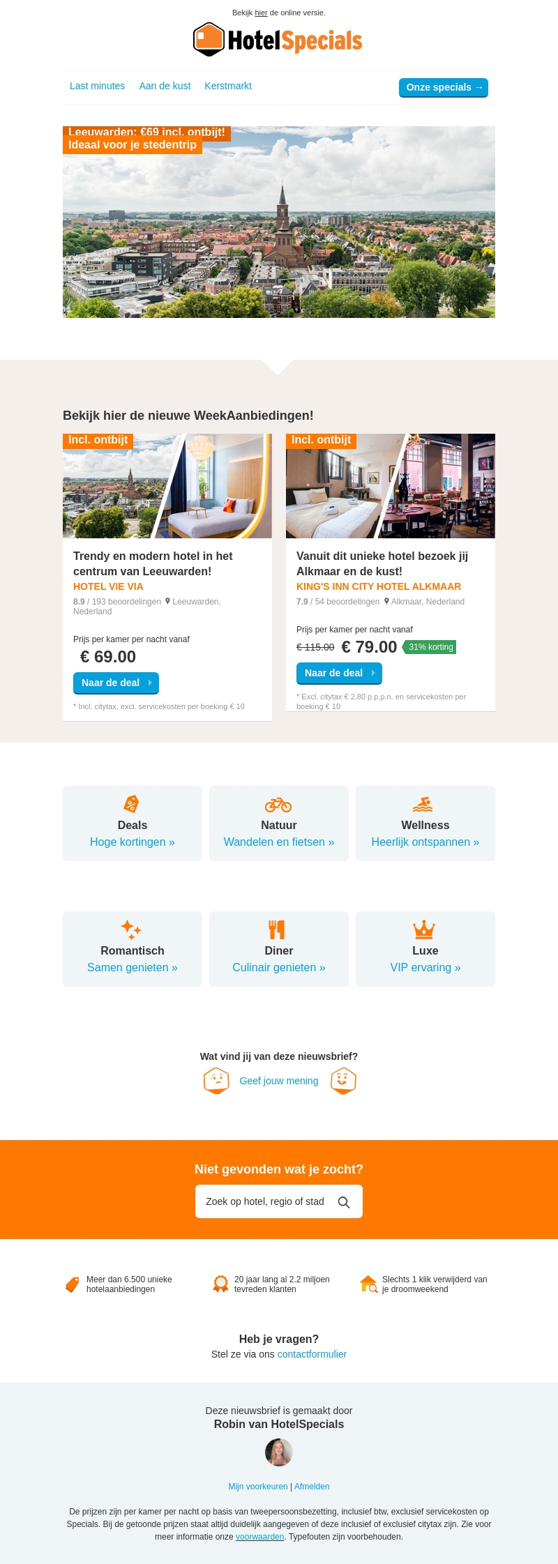 Bezoek Leeuwarden voor slechts €69 per nacht inclusief ontbijt. Geniet van een trendy hotel in het centrum. Of verken Alkmaar en de kust vanuit King's Inn City Hotel voor €79 per nacht. Beide aanbiedingen zijn inclusief ontbijt. Mis deze geweldige deals niet!