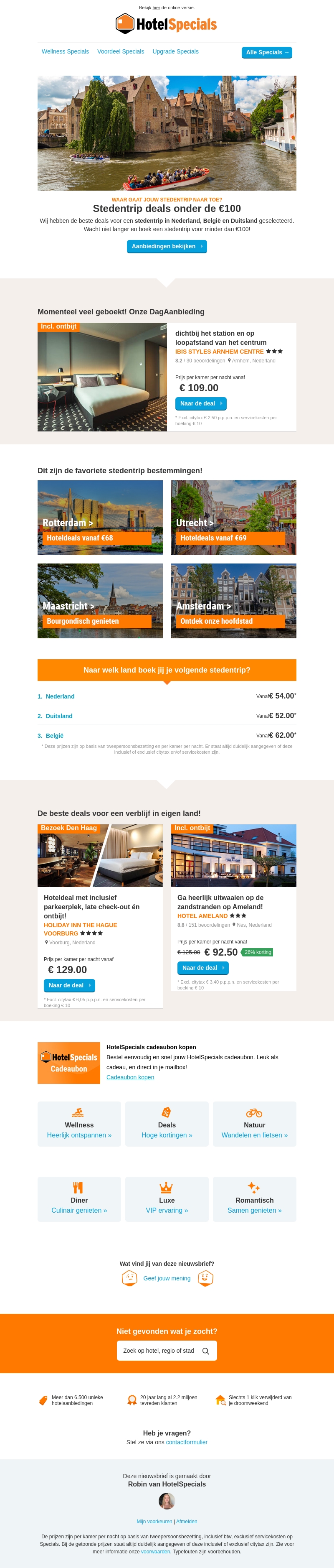 Ontdek de beste stedentrip deals onder de €100 bij HotelSpecials. Reis naar populaire bestemmingen zoals Rotterdam, Utrecht, Maastricht, en Amsterdam. Profiteer van speciale aanbiedingen, inclusief ontbijt en extra's bij geselecteerde hotels. Boek vandaag nog je voordelige stedentrip en geniet van een onvergetelijk uitje.