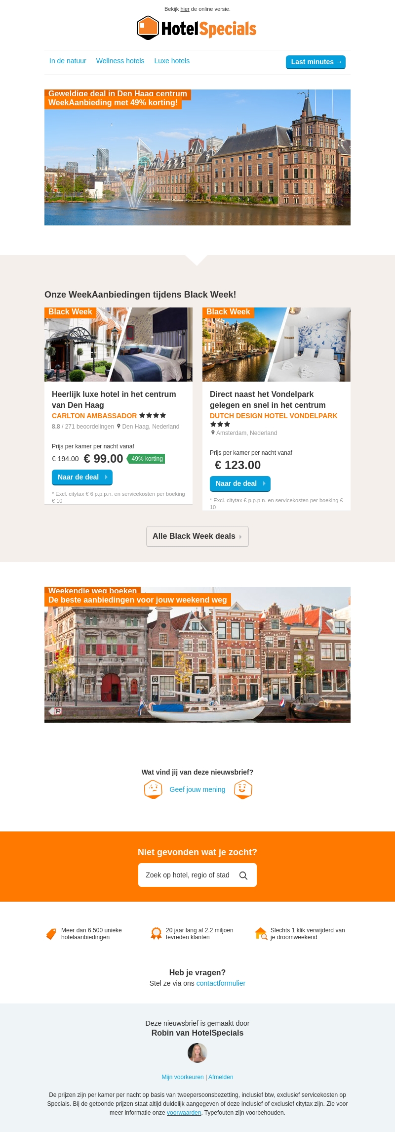 Ga op avontuur met onze geweldige deals in Den Haag en Amsterdam tijdens de Black Week. Verblijf in luxe hotels met kortingen tot wel 49%! Geniet van een directe locatie bij Vondelpark of verblijf in het hart van Den Haag. Pak deze kans om even helemaal op te laden in stijl en comfort.