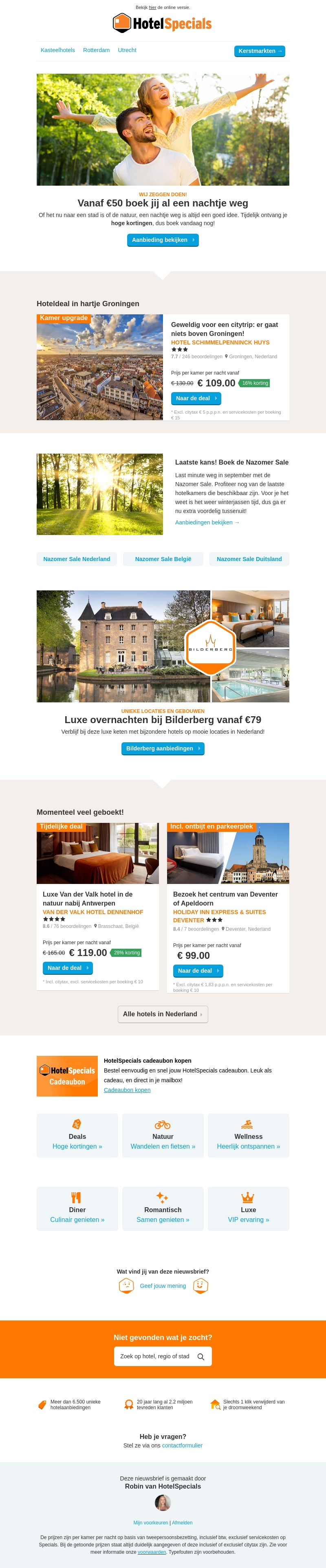 Ontsnap aan de dagelijkse sleur en boek eenvoudig een nachtje weg vanaf slechts €50! Dankzij HotelSpecials profiteer je van scherpe kortingen op hotels in Nederland. Laatste kans om te genieten van de Nazoemer Sale. Bovendien zijn er luxe overnachtingen beschikbaar bij Bilderberg hotels vanaf €79. Mis deze geweldige deals niet en boek vandaag nog.