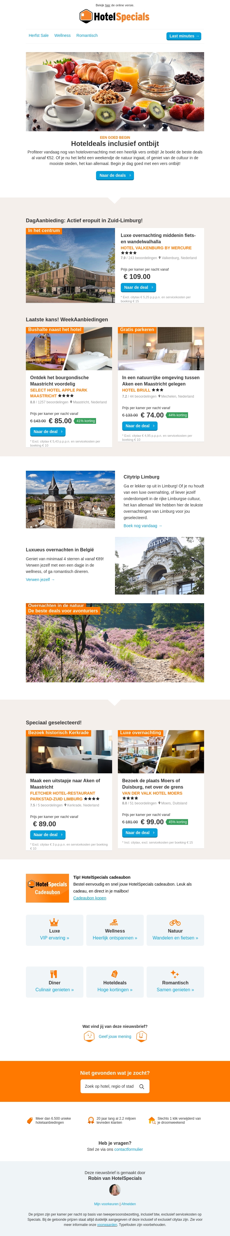 Profiteer van geweldige hoteldeals inclusief ontbijt. Geniet van luxe en comfort in Zuid-Limburg of ontdek de Bourgondische charme van Maastricht. Boek nu en beleef een heerlijke ontsnapping in eigen land.