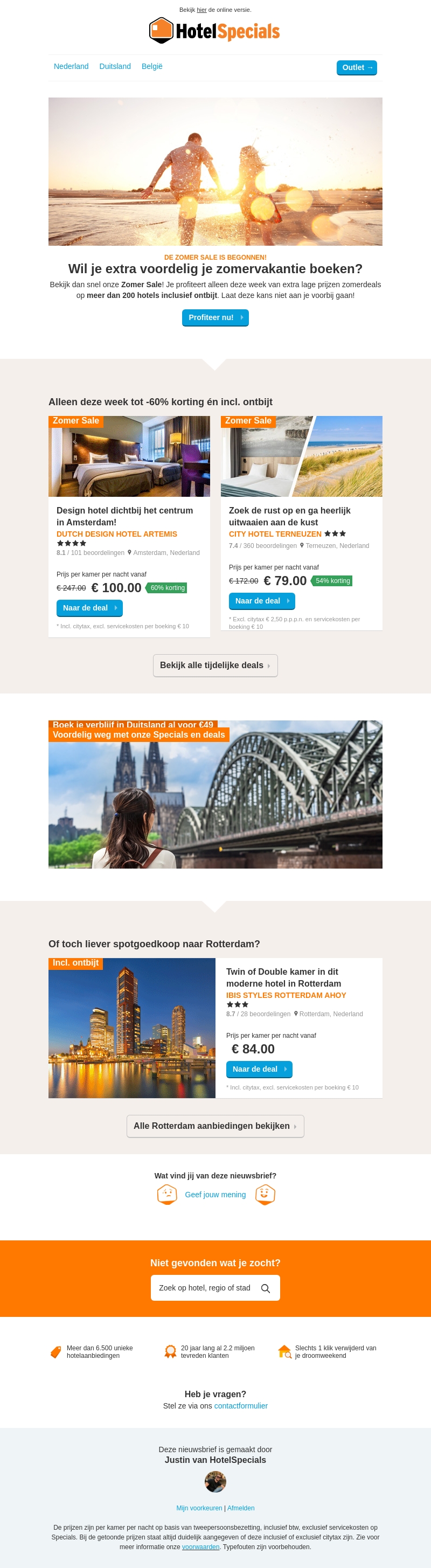 De Zomer Sale is begonnen! Boek je zomervakantie nu en profiteer van kortingen tot wel 70% bij meer dan 200 hotels inclusief ontbijt. Mis deze unieke kans niet en bekijk onze tijdelijke deals in Nederland, Duitsland en België.