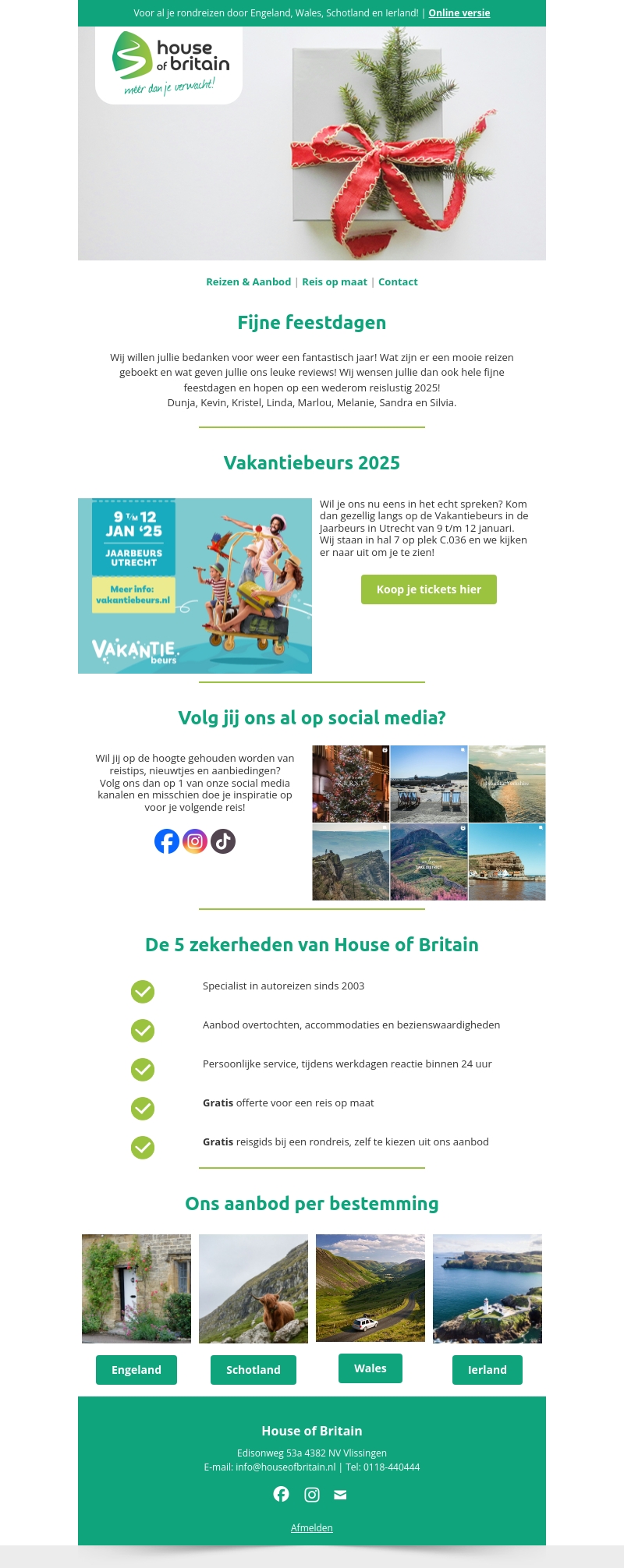 House of Britain wenst je fijne feestdagen en bedankt je voor een fantastisch jaar. Bezoek ons op de Vakantiebeurs 2025 van 9 t/m 12 januari in Utrecht en ontmoet ons persoonlijk. Volg ons op social media voor de laatste reisupdates. Ontdek onze 5 zekerheden: specialistische autovakanties, diverse overtochten, persoonlijke service, en meer.