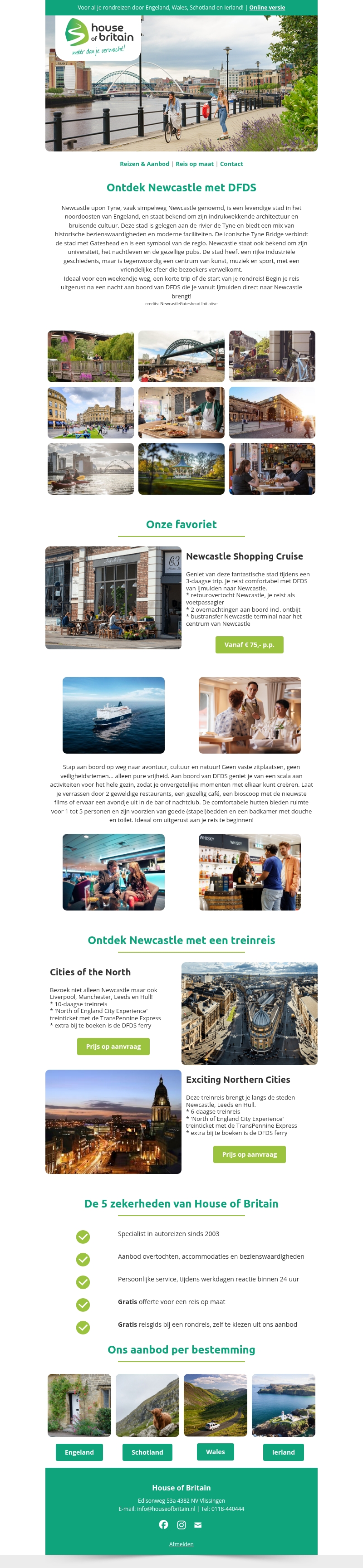 Ontdek de bruisende stad Newcastle met DFDS. Geniet van architectuur, cultuur en moderne faciliteiten tijdens een drie-daagse trip. Bezoek historische bezienswaardigheden en proef de lokale sfeer. Boek een Newcastle Shopping Cruise of een avontuurlijke treinreis door het noorden van Engeland. Begin je reis vanaf slechts β¬75 per persoon.
