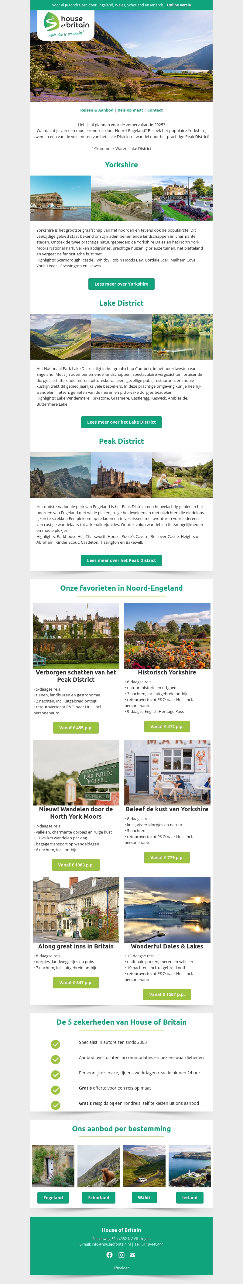 Plan je volgende vakantie naar Noord-Engeland en ontdek de populaire regio's zoals Yorkshire, Lake District en Peak District. Geniet van prachtige landschappen, historische bezienswaardigheden en unieke reiservaringen. Met House of Britain krijg je speciale aanbiedingen voor een onvergetelijk avontuur.