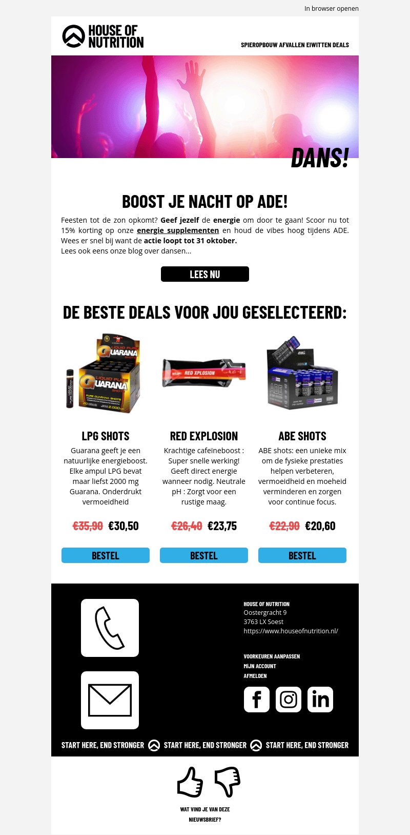 Mis deze kans niet om je nachten tijdens ADE onvergetelijk te maken! Ontvang tot 15% korting op onze energie supplementen en houd je energieniveau hoog. Profiteer van deze aanbieding voor 31 oktober en ontdek krachtige producten zoals LPG Shots, Red Explosion en ABE Shots. Deze supplementen zijn specifiek ontworpen om je fysieke prestaties te verbeteren. Zorg dat je voorbereid bent op een onvergetelijke ervaring!