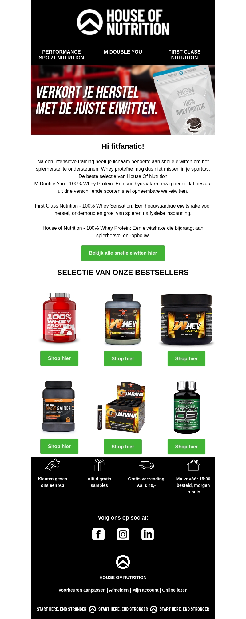 Na een intensieve training is het essentieel om snelle eiwitten te gebruiken voor effectief spierherstel. Bij House of Nutrition vind je een zorgvuldig geselecteerde lijn van whey proteรฏnen die bijdragen aan herstel en opbouw van spiermassa. Ontdek producten zoals M Double You en First Class Nutrition, ontworpen om je fysieke prestaties te ondersteunen. Bestel nu en ervaar het verschil.