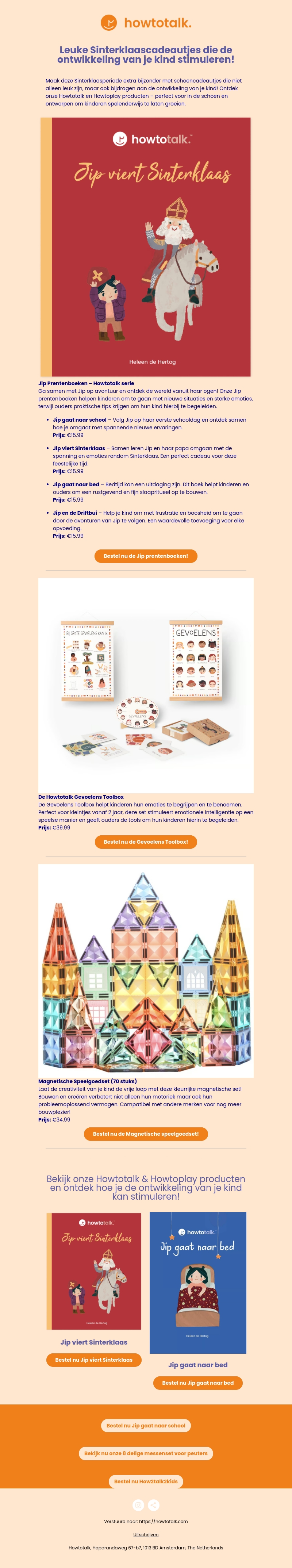 Maak deze Sinterklaasperiode extra bijzonder met cadeautjes die niet alleen leuk zijn, maar ook bijdragen aan de ontwikkeling van je kind. Ontdek de Howtotalk prentenboeken en tools die spelenderwijs leren bevorderen. Kies uit leuke verhalen, emotionele ontwikkelingstools en kleurrijke bouwsets.