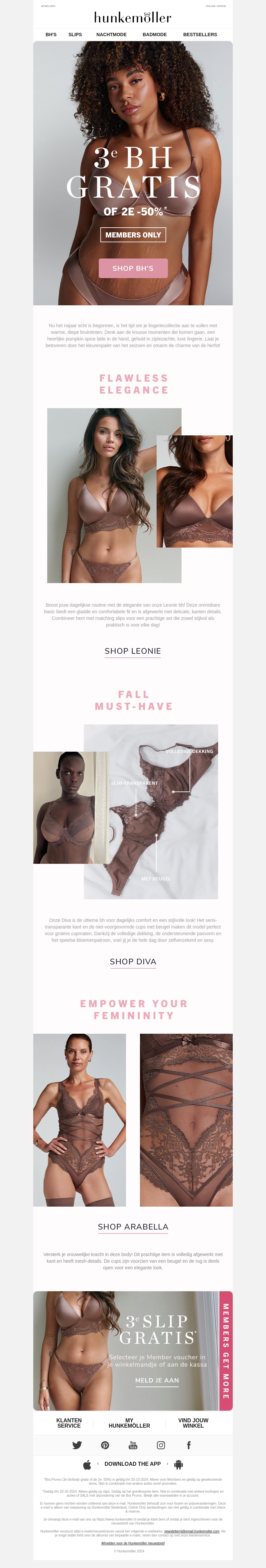 Deze nieuwsbrief brengt je de nieuwste herfsttinten in lingerie. Speciaal voor leden bieden we fantastische acties: koop 3 BH's en ontvang de derde gratis of de tweede met 50% korting. Ontdek onze nieuwste collecties zoals 'Leonie', 'Diva', en 'Arabella' die elegantie en comfort combineren. Bezoek onze winkel en ervaar de perfecte pasvorm. Mis deze kans niet!
