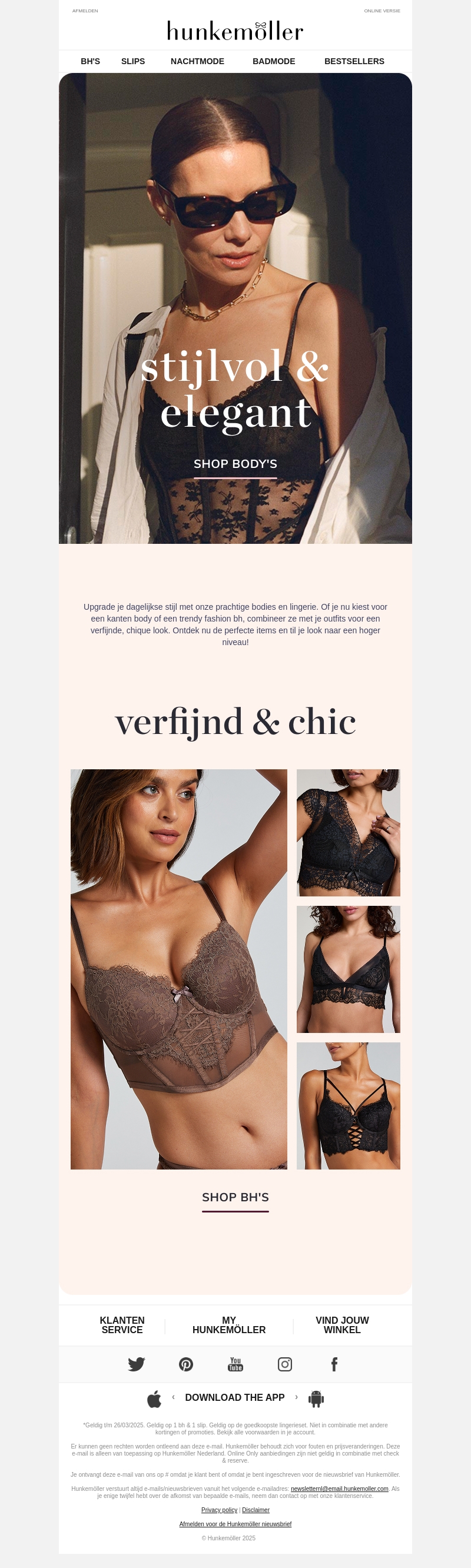 Verwen jezelf met de verfijnde lingeriecollectie van Hunkemöller. Kies uit luxe kanten body’s en trendy fashion BH's om jouw outfit naar een hoger niveau te tillen. Of je nu een avondje uitgaat of een chique look wilt creëren, ontdek de perfecte items die jouw stijl compleet maken.