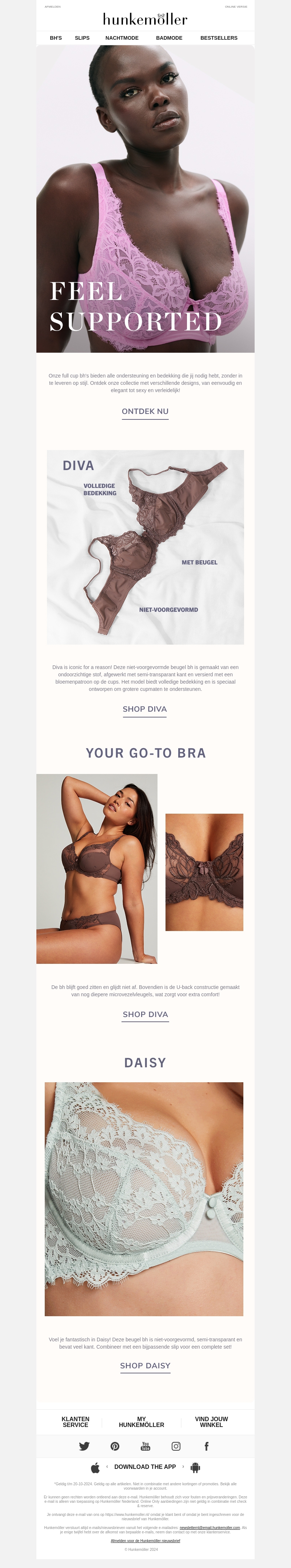 Onze bh's bieden alle ondersteuning en bescherming die je nodig hebt. Ontdek de nieuwste collectie met verschillende stijlen, patronen en kleuren. Shop nu de Diva en Daisy bh's voor ultiem comfort en een elegante look.