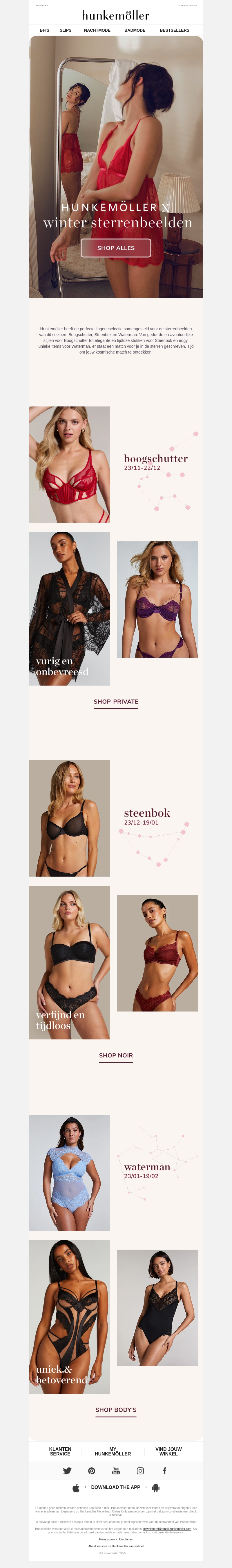 Ontdek de nieuwste collectie van Hunkemöller met prachtige lingerie geïnspireerd door sterrenbeelden. Verwen jezelf met stijlvolle en verfijnde ontwerpen, ideaal voor de wintermaanden. Van vurige en avontuurlijke looks tot verfijnde en tijdloze stukken, er is voor ieder wat wils. Shop nu en voel je uniek en betoverend in de nieuwste stijlen.