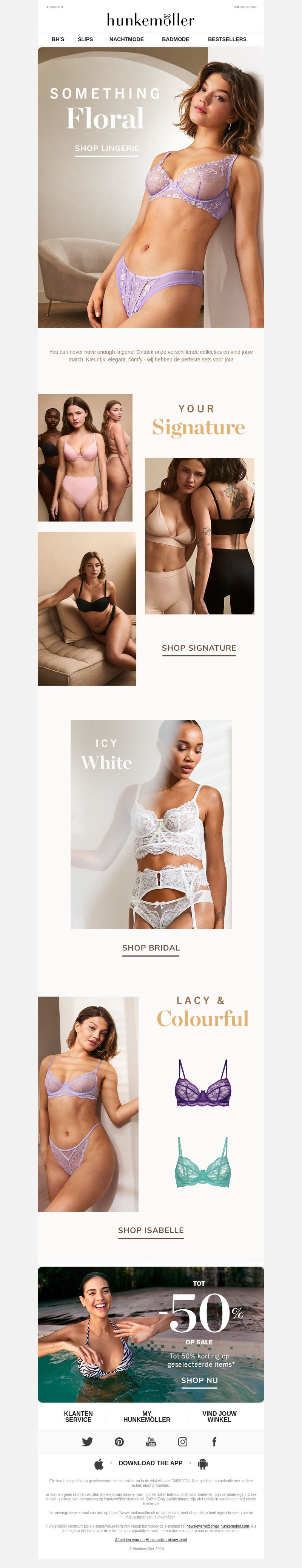 Je verdient nieuwe lingerie! Ontdek de nieuwste collectie van Hunkemöller. Van bloeiende bloemenprints tot klassieke witte kanten en levendige kleuren, er is iets voor elke stijl. Koop nu en geniet van de hoogste kwaliteit en comfort. Bovendien krijg je tot 50% korting op geselecteerde items.