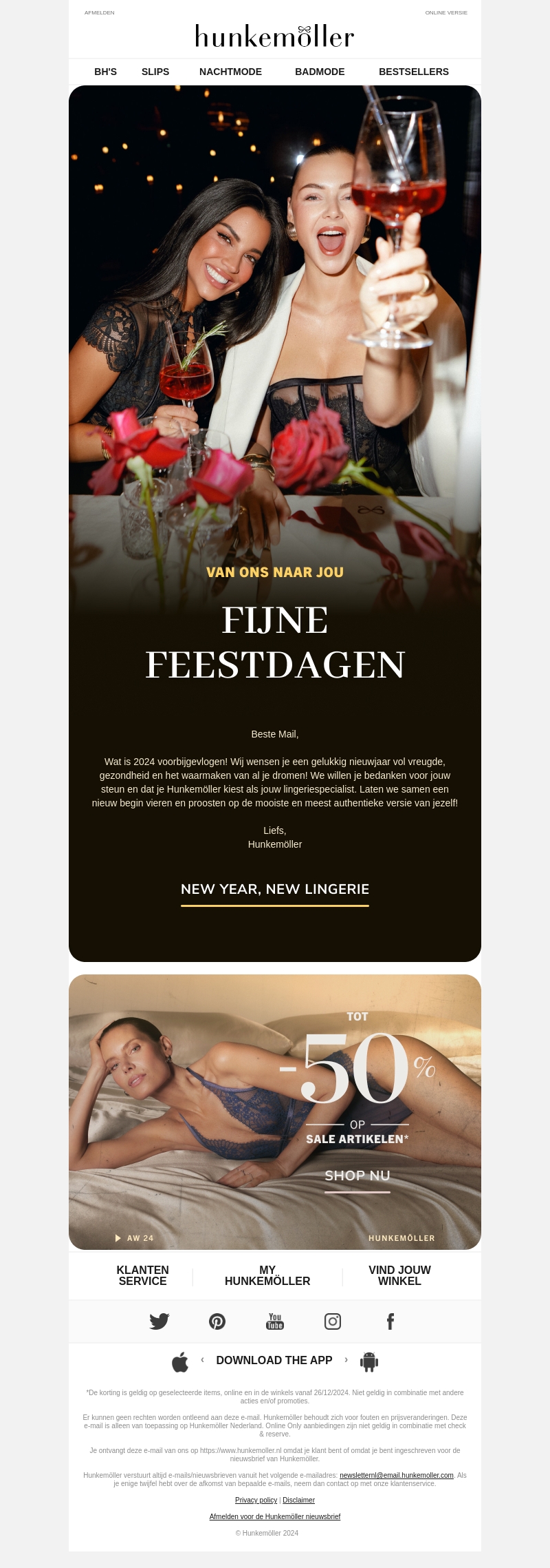 Het jaar 2024 is voorbijgevlogen! We wensen je fijne feestdagen en een gelukkig nieuwjaar. Hunkemöller bedankt je voor jouw steun en biedt nu tot wel 50% korting op geselecteerde artikelen. Proost op het nieuwe jaar met de mooiste lingerie. Waar wacht je nog op? Shop nu online of in de winkel!