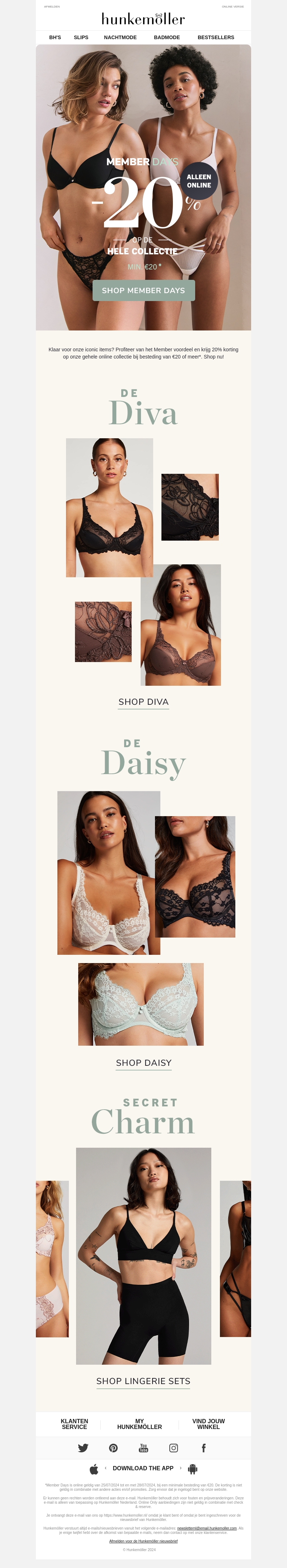 Leden profiteren nu van 20% korting op de gehele Hunkemöller-collectie. Mis deze unieke kans niet en vernieuw je garderobe met onze prachtige lingerie. De korting is exclusief online en geldt voor een minimale besteding van €20. Shop nu en ontdek onze Diva, Daisy en Secret Charm collecties.