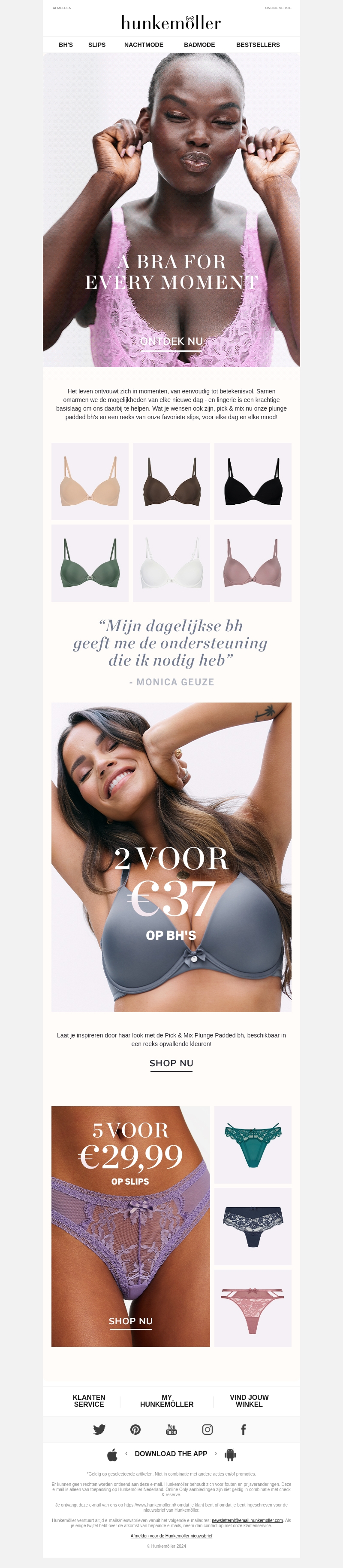 Hunkemöller lanceert een nieuwe collectie met perfecte basics en go-to pieces. Inclusief stijlvolle beha's en slipjes in verschillende kleuren. Geniet van speciale aanbiedingen met voordeelacties zoals 2 voor €37 op beha's en 5 voor €29,99 op slipjes. Ontdek nu jouw nieuwe favoriete lingerie!