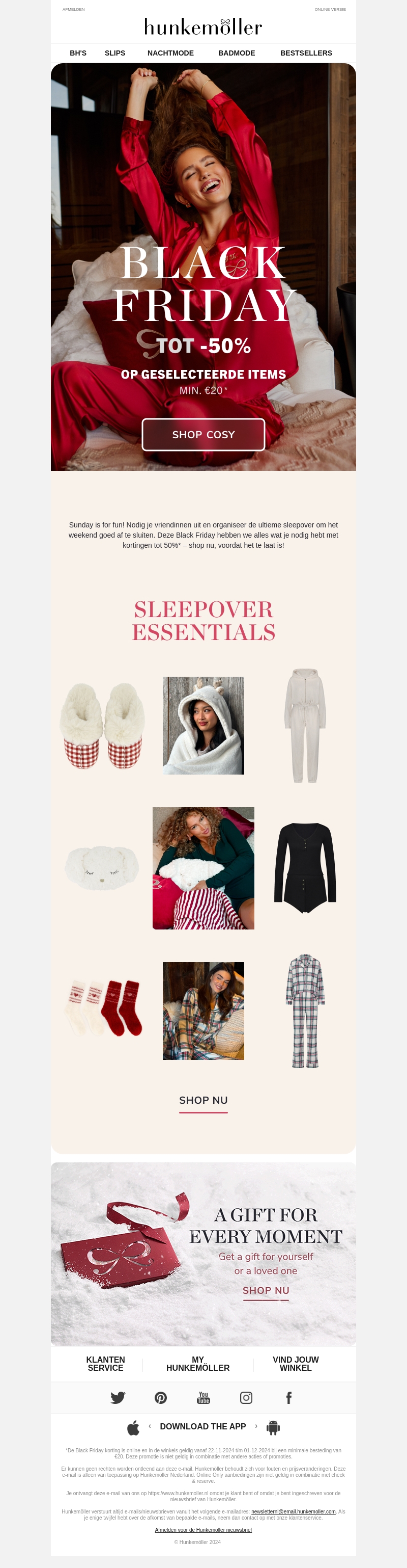 Vier Black Friday met fantastische kortingen tot 50% op geselecteerde nachtmode-essentials. Onze stijlvolle selectie bevat alles wat je nodig hebt voor de perfecte slaapervaring. Mis deze kans niet om je garderobe met trendy pyjama's en accessoires te upgraden en te genieten van ultiem comfort. Bezoek onze winkel of shop online vanaf 22 november. Zorg ervoor dat je jouw favorieten grijpt terwijl de voorraad strekt!