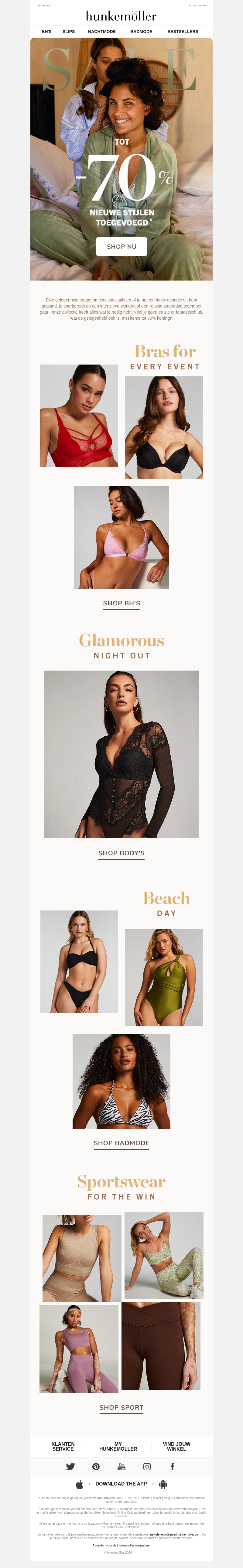 Elke gelegenheid vraagt om iets speciaals! Bij Hunkemöller krijg je nu tot 70% korting op nieuwe stijlen. Van glamoureuze nachtkleding tot trendy sportkleding, er is voor elk wat wils. Mis deze kans niet en shop nu jouw favoriete stukken.