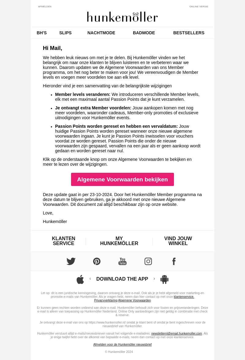We hebben belangrijk nieuws voor je! Hunkemöller heeft de Algemene Voorwaarden voor het Member programma geüpdatet. We introduceren nieuwe Member levels, extra voordelen, en een vervaldatum voor Passion Points. Lees verder om te zien wat er verandert en welke voordelen je kunt verwachten.