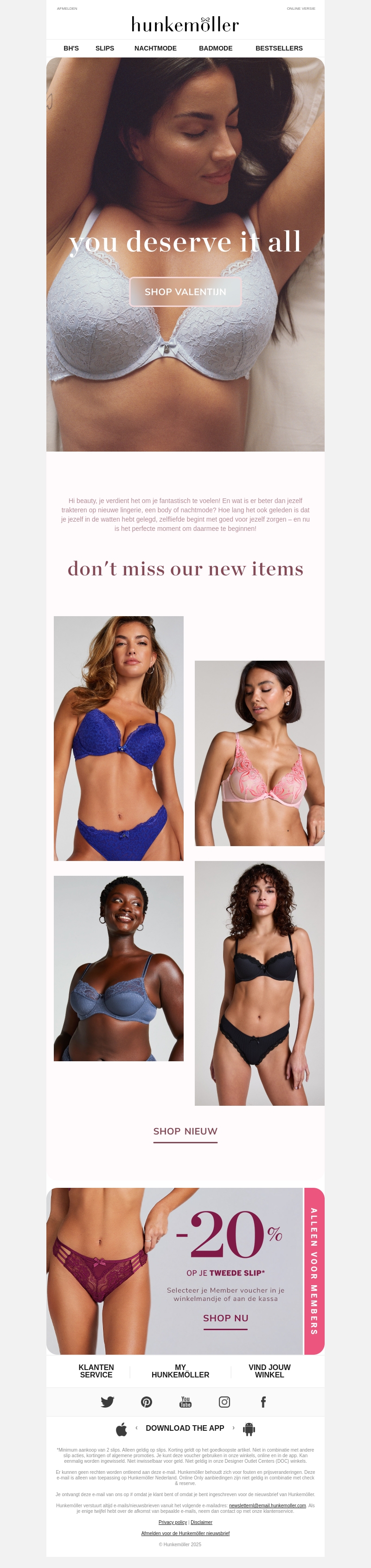 Ontdek de nieuwste collectie van Hunkemöller en geef jezelf een cadeau vol zelfliefde deze Valentijnsdag. Met exclusieve aanbiedingen en een prachtige selectie, voel je je op je best. Mis onze nieuwe items niet en shop de perfecte look voor jezelf. Profiteer van 20% korting op je tweede slip bij je volgende aankoop.