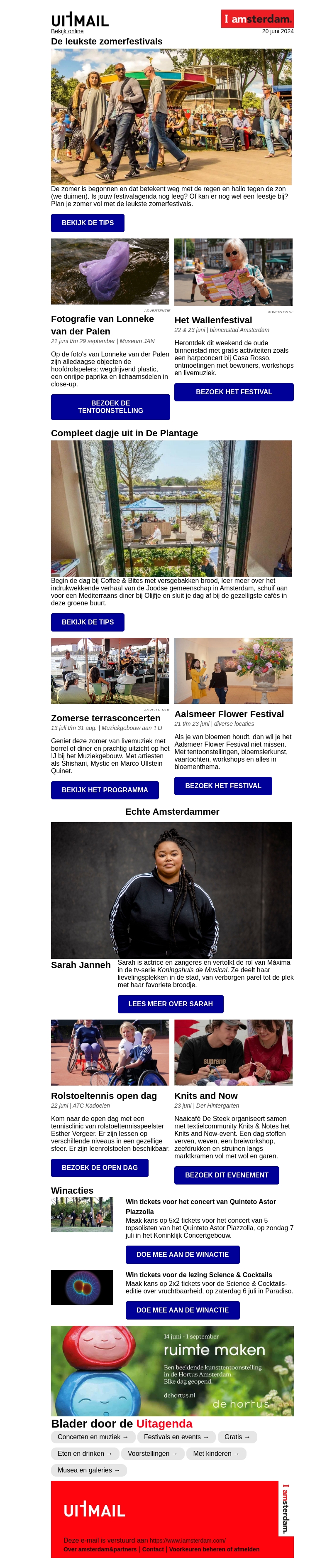 De zomer is begonnen! Ontdek de leukste zomerfestivals in Amsterdam, zoals het Wallenfestival en de zomerse terrasconcerten. Plan een compleet dagje uit in de Plantage met koffie en een bezoek aan diverse cafés. Lees meer over de echte Amsterdammer Sarah Jannen en maak kans op tickets voor concerten en evenementen.
