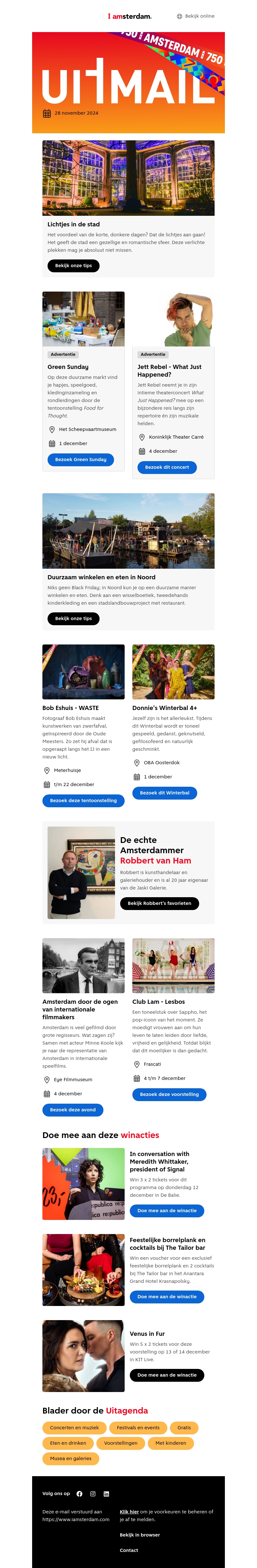 Verken Amsterdam tijdens het lichtfestival en ontdek duurzame opties om te winkelen en te eten in Noord. Bezoek diverse events en tentoonstellingen die de stad te bieden heeft. Mis ook de unieke winacties niet om extra plezier te beleven.