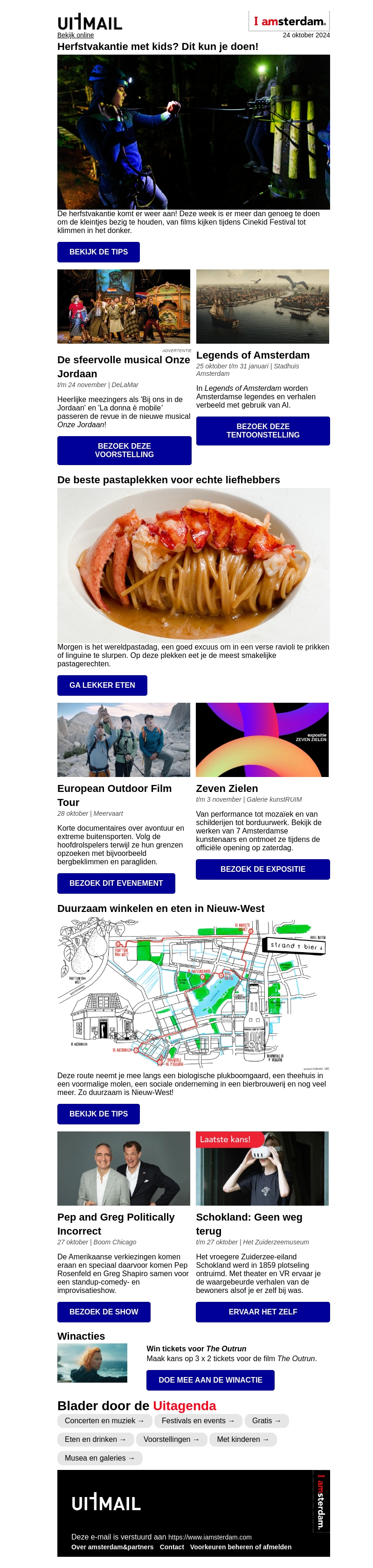 Beleef een avontuurlijke herfstvakantie met de kinderen, van klimmen in het donker tot het bijwonen van musicals en tentoonstellingen. Probeer de beste pasta in Amsterdam tijdens Wereldpasta Dag. Ontdek ook evenementen zoals de European Outdoor Film Tour en exposities van lokale kunstenaars.