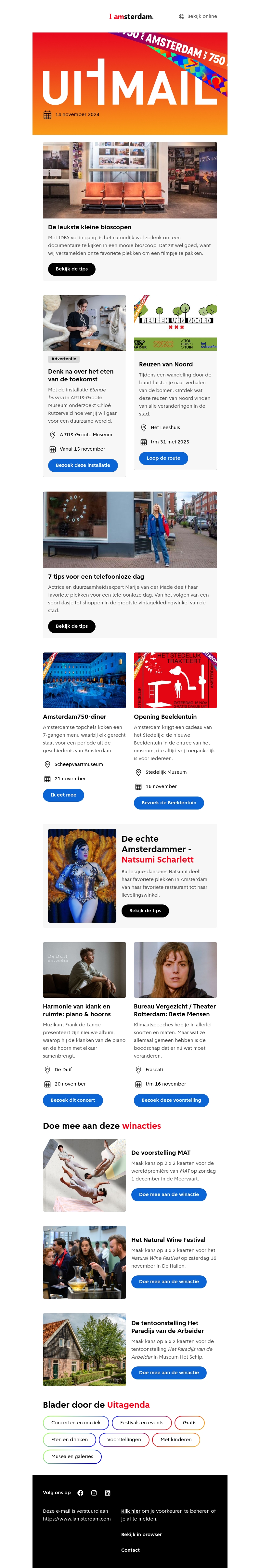 Deze nieuwsbrief biedt een inspirerende inkijk in de leukste bioscopen en handige tips voor een dag zonder telefoon. Verken de charme van Amsterdamโs verborgen parels en plan een onvergetelijke uitstap. Ontvang ook exclusieve toegang tot Amsterdam 750 evenementen en ontdek nog meer cultuurtips gereed voor elk avontuur.