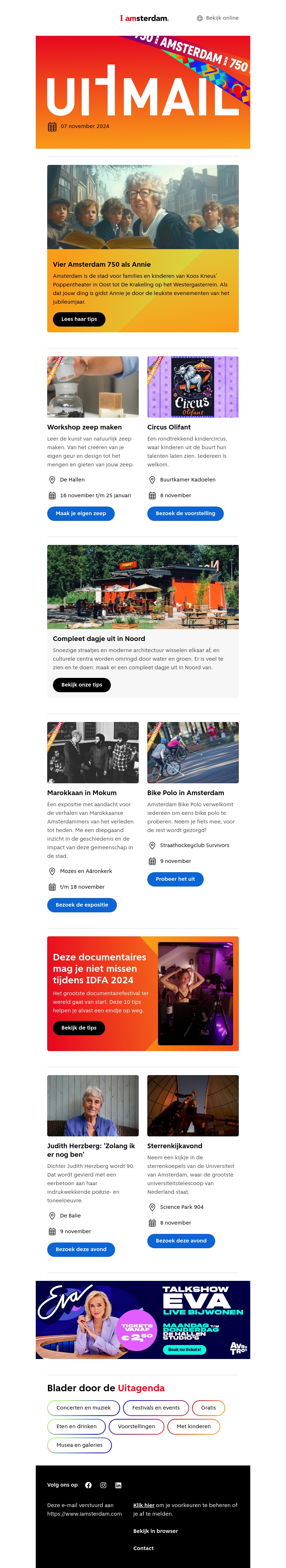Ontdek hoe je 750 jaar Amsterdam viert met de kinderen in de rol van Annie. Geniet van workshops, circusvoorstellingen, en een complete dag in Noord. Mis de tentoonstelling 'Marokkaan in Mokum' en Amsterdam Bike Polo niet! Bekijk de beste documentaires tijdens IDFA 2024 en sluit je dag af met een avond vol poëzie en muziek.