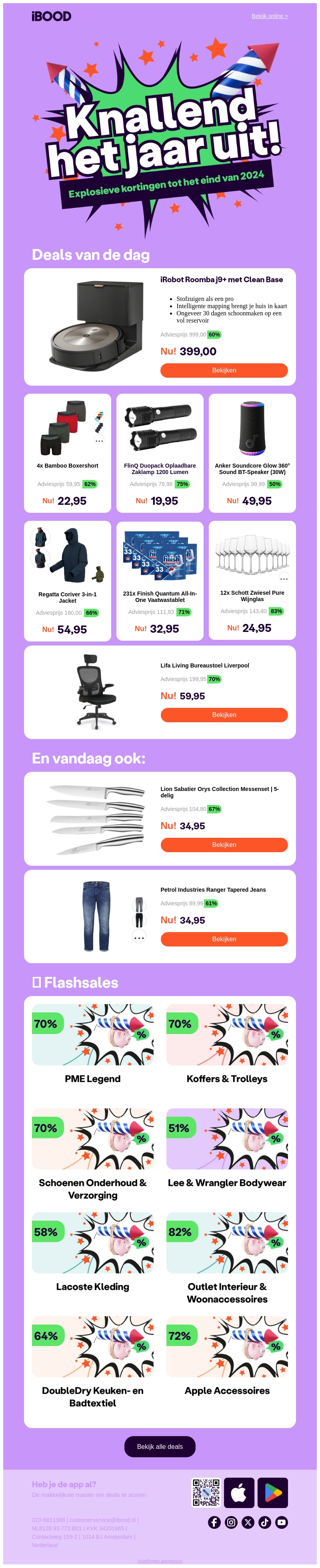 Profiteer van de explosieve eindejaarsknallers bij iBOOD met kortingen tot wel 79%! Ontdek de iRobot Roomba J9+ met Clean Base voor slechts €399. Inclusief deals op andere topmerken zoals Anker, Regatta en PME Legend. Perfect om het jaar stijlvol af te sluiten. Grijp nu je kans en shop jouw favoriete deals!