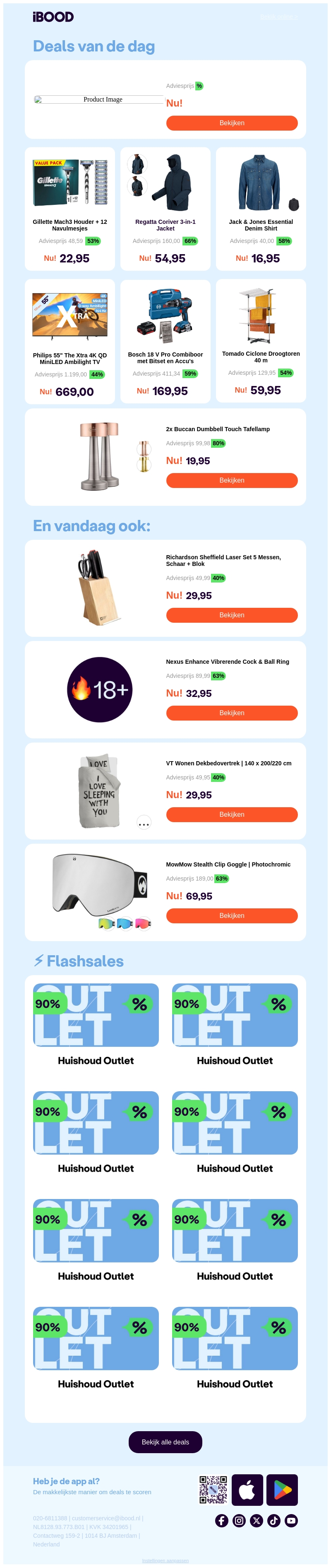 Mis de ongelooflijke deals van de dag niet bij iBOOD! Van Gillette scheermessen tot handige huishoudelijke apparaten, er is voor ieder wat wils. Ontvang tot wel 80% korting op geselecteerde items zoals de Regatta jas en Bosch boorcombi. Grijp je kans op deze beperkte aanbiedingen voordat ze weg zijn!
