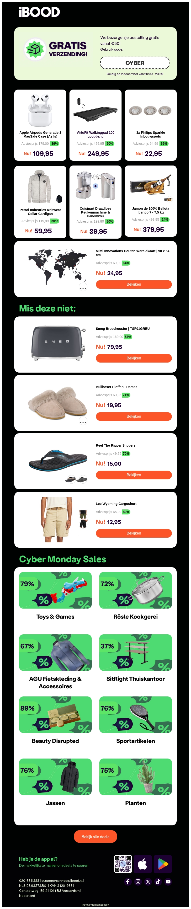 iBOOD biedt nu gratis verzending aan voor bestellingen vanaf €50. Mis de geweldige Cyber Monday kortingen niet met producten zoals Apple AirPods en wandelplanken. Gebruik de couponcode 'CYBER' om te profiteren. Deze aanbieding is geldig tot 2 december 23:59.