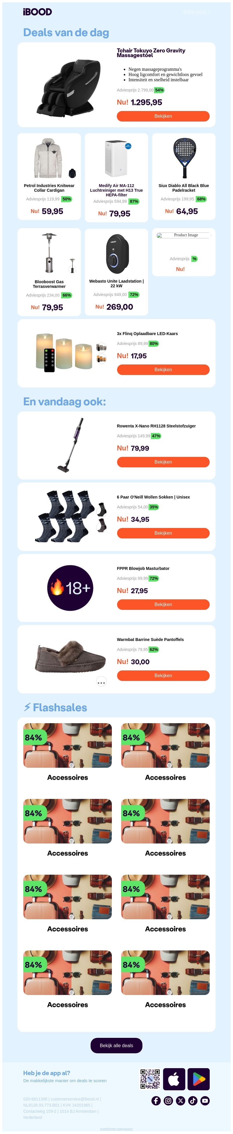 De iBOOD nieuwsbrief presenteert de deal van de dag: de Tokuyo Zero Gravity Massagestoel voor slechts €1.295,95. Ontspan met negen massageprogramma's en een hoog ligcomfort. Mis ook niet de andere geweldige aanbiedingen, inclusief een knitwear collar cardigan en Medify Air luchtreiniger.