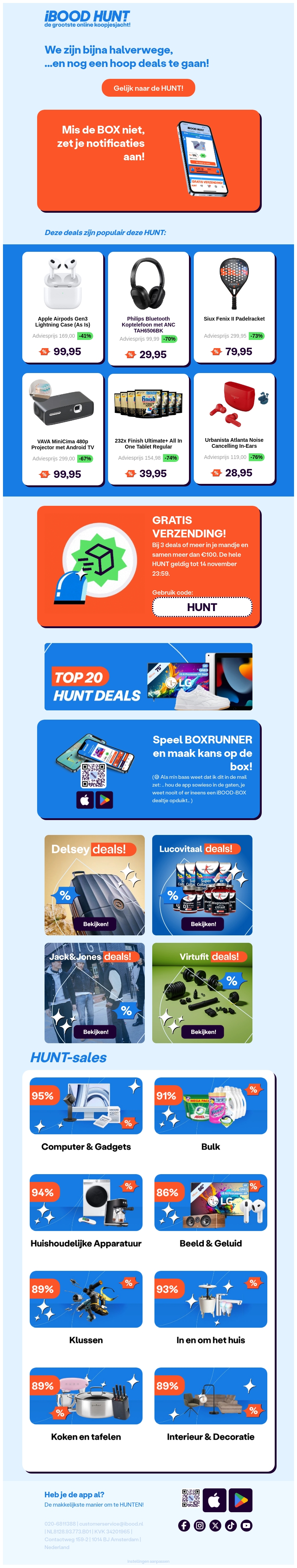 Ontdek de nieuwste iBOOD Hunt-deals en bespaar groots op topmerken zoals Apple, Philips en meer. Met kortingen tot 94% is er voor ieder wat wils, van tech-gadgets tot huishoudelijke apparatuur. Profiteer van gratis verzending bij een minimale besteding van €100. Haal de deals in huis voordat ze weg zijn en download de app voor nog sneller winkelen.